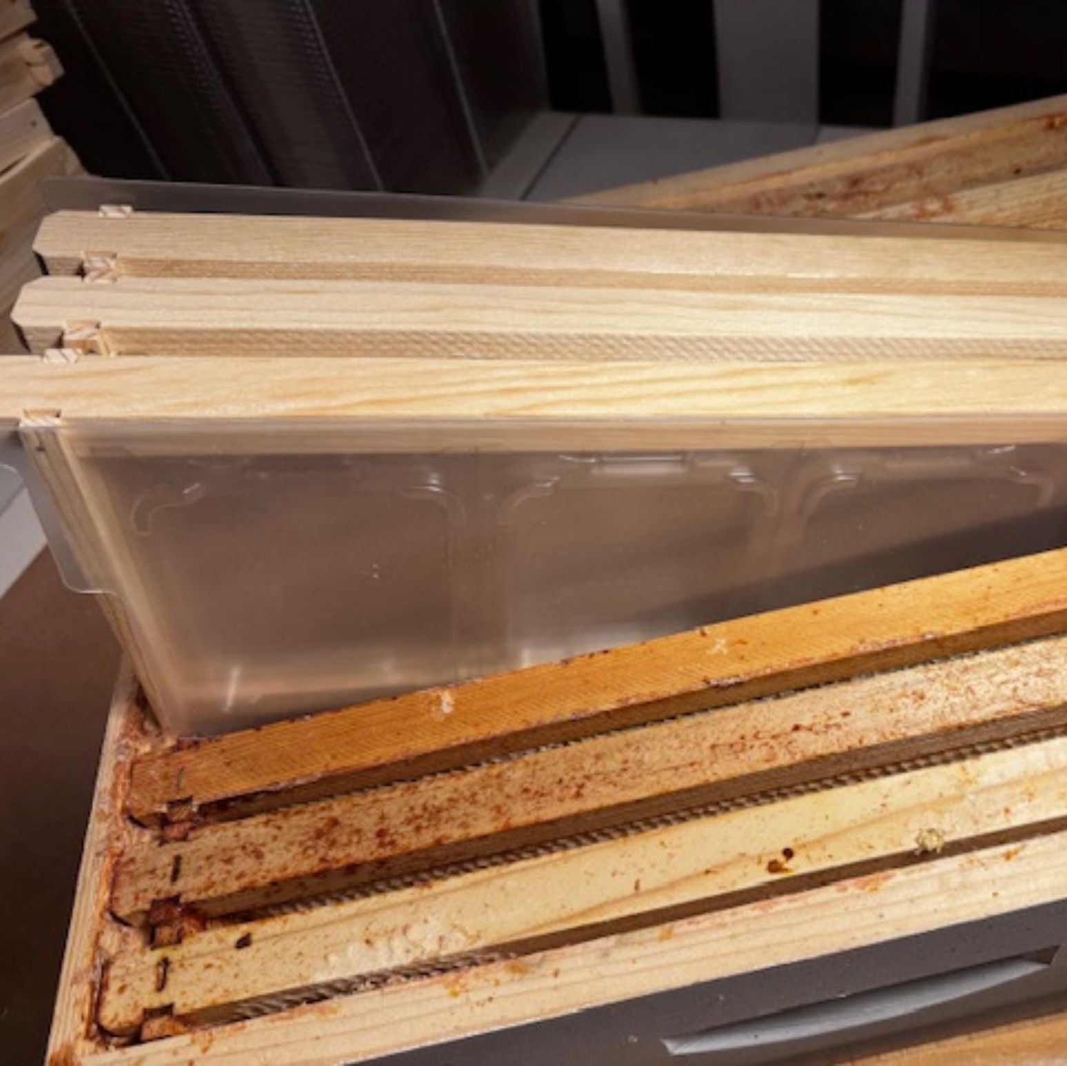 - Leave the regular drawn comb on the outsides of your super, and fill the center space with waxed SimplKomb Frames.